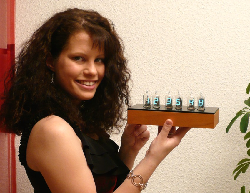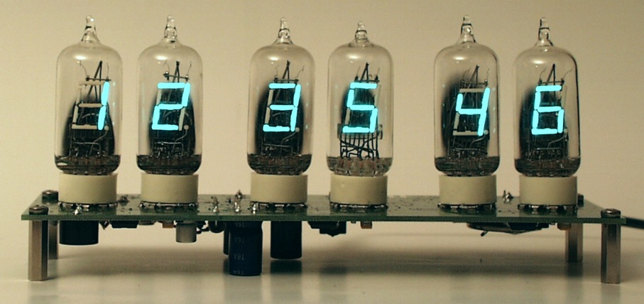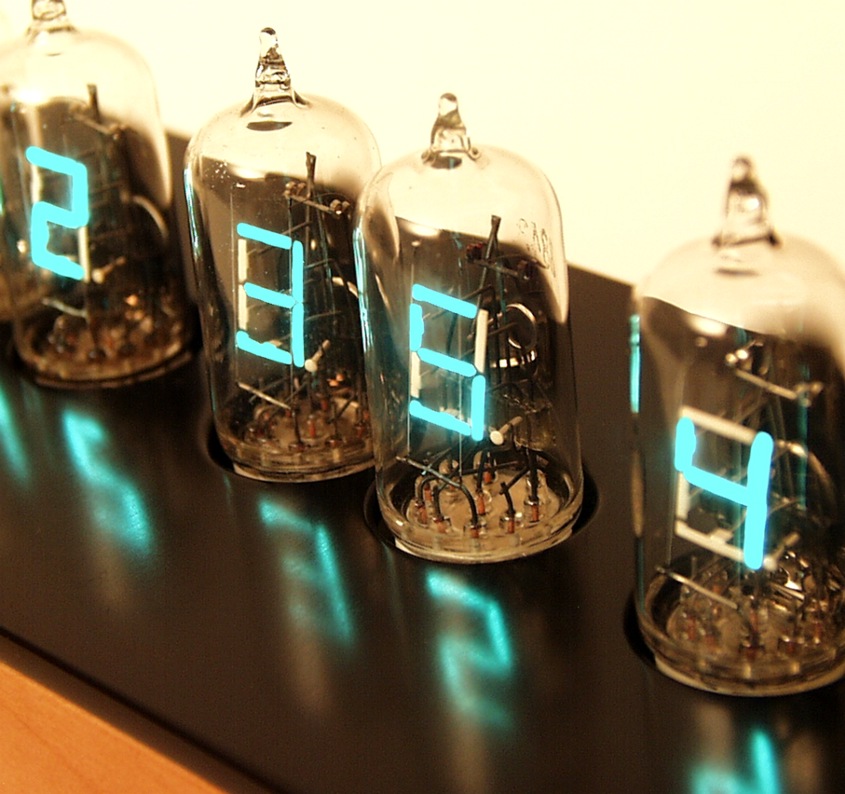 This clock uses tube types 8843 or 8894 made by Sylvania in the early seventies. The cathode is made up of fine tungsten